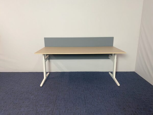 Bureau Ahrend (incl. lichtblauwe akoestische wand), eiken blad, wit onderstel, 180 x 80 cm.
