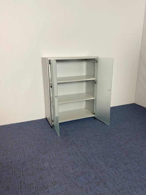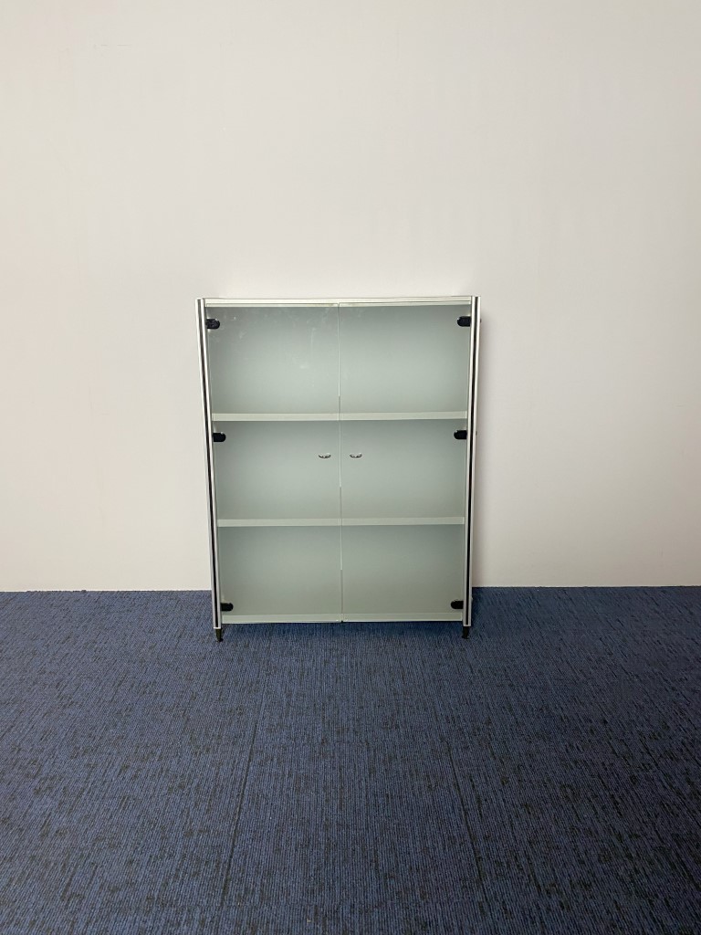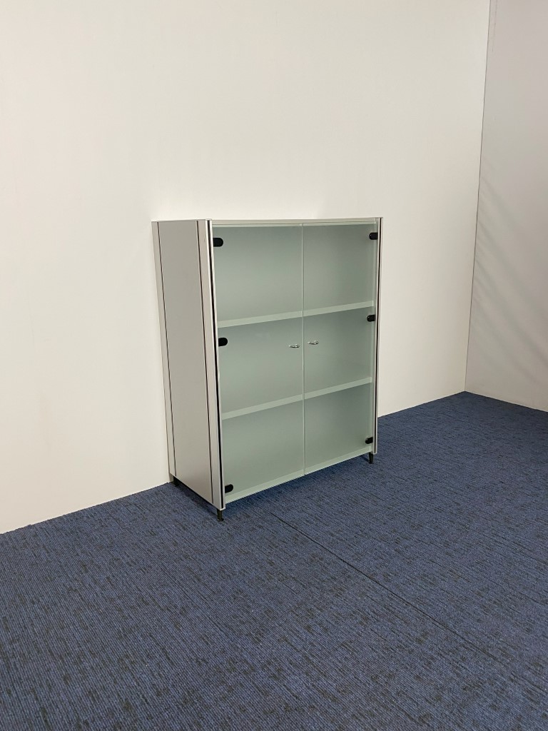 Klapdeurkast Konig + Neurath, aluminium met glazen deuren, H 113 x B 86 x D 43 cm.