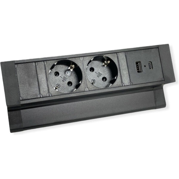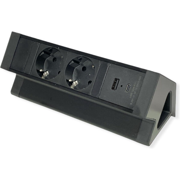 Opbouw stekkerdoos zwart voor op uw bureau met 2 geaarde stopcontacten en 2 USB laders.