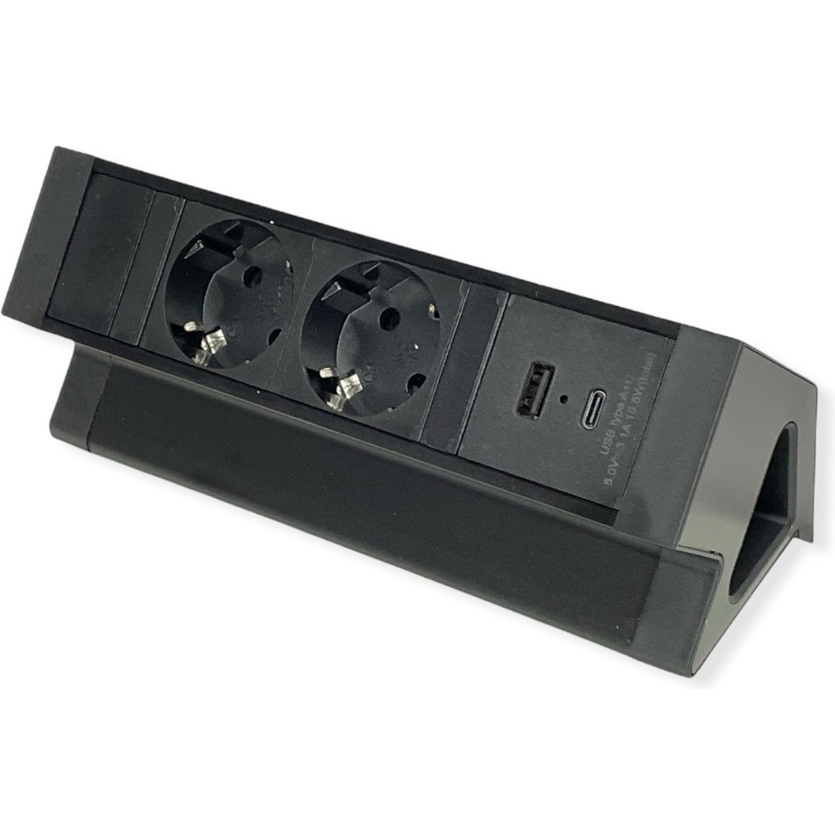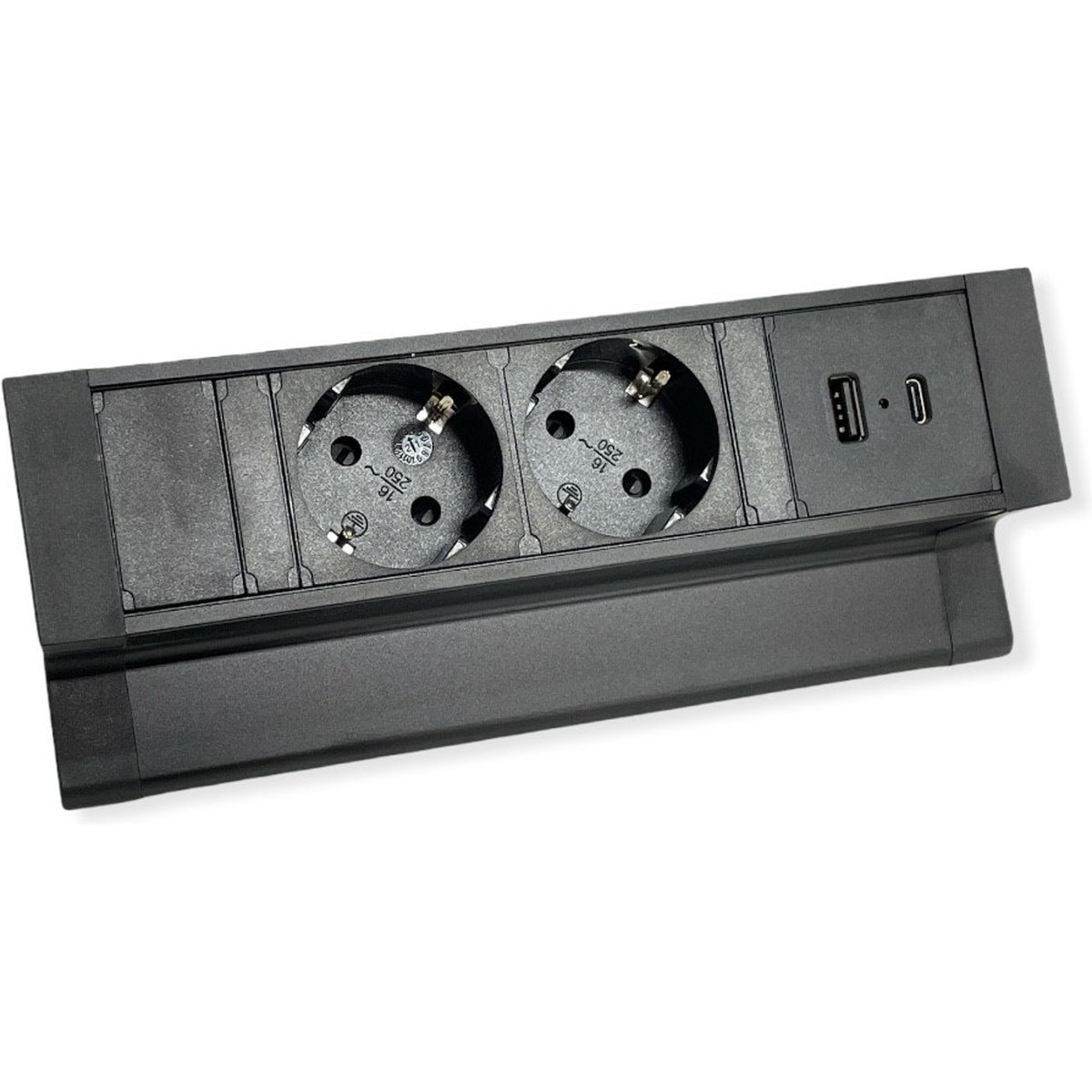 Het stekkerblok is 200 mm breed en is met bladklemmen op een bureau of tafel te bevestigen tot een blad dikte van 48 mm. De montage schroeven (inbus) worden meegeleverd.
