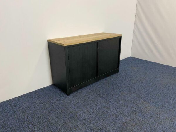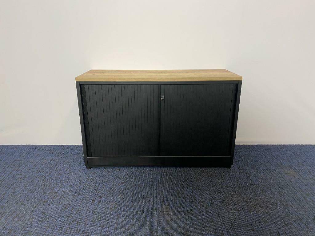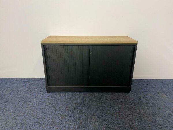 Roldeurkast Ahrend, zwart (nieuw gespoten), nieuw topblad, H 74 x B 120 x D 45 cm.