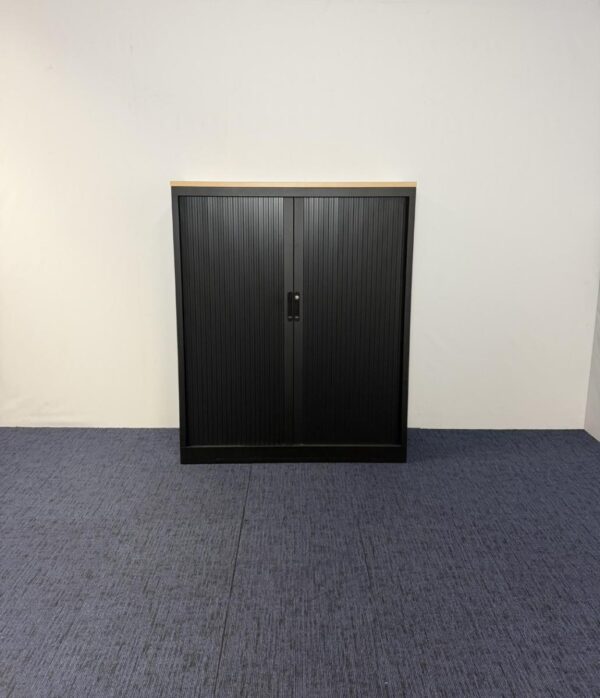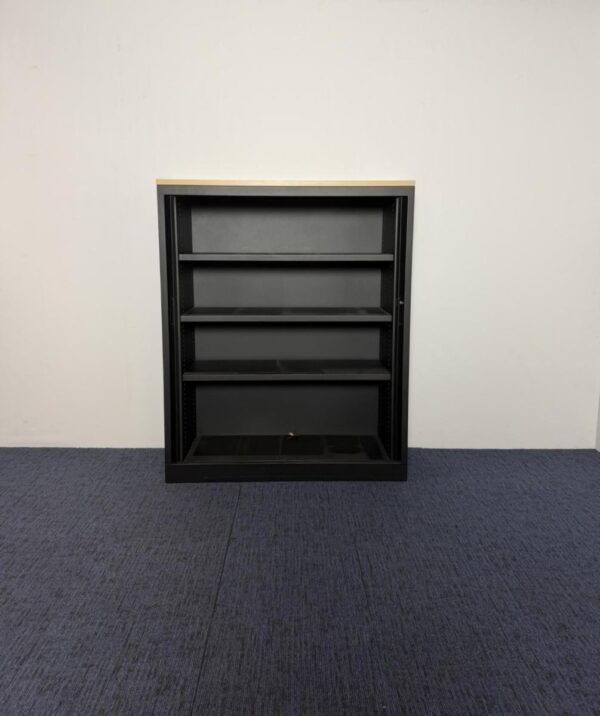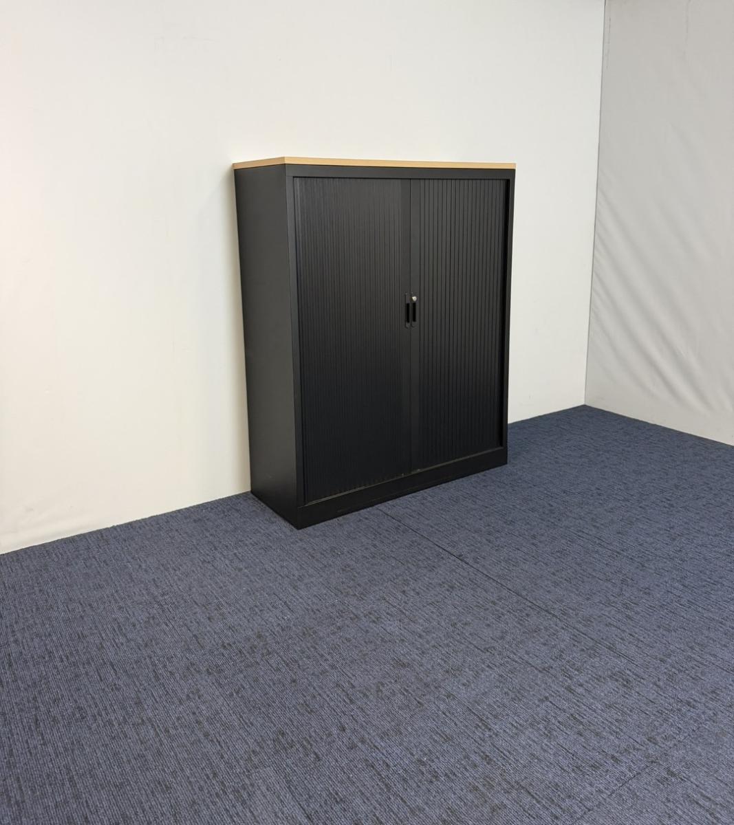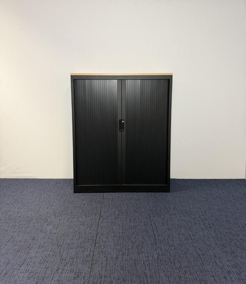 Roldeurkast Ecotec, zwart, beuken topblad, H 147 x B 120 x D 45 cm.