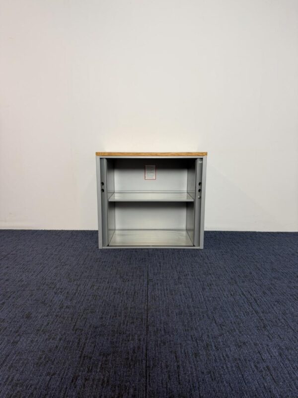 Roldeurkast Gispen Meta, aluminium, donker beuken topblad, H 74 x B 80 x D 47 cm.