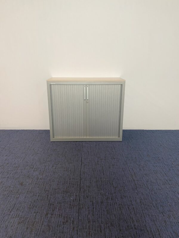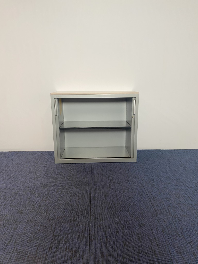 Roldeurkast Steelcase, aluminium, licht eiken topblad, H 85 x B 100 x D 43 cm.