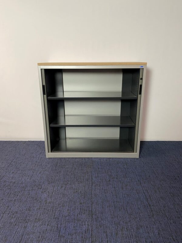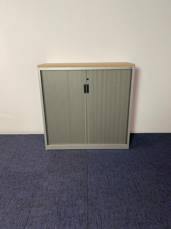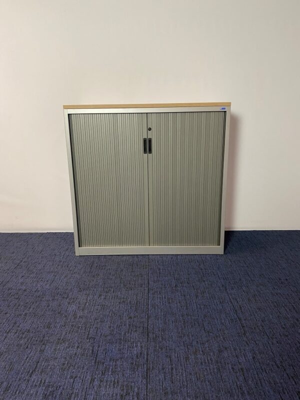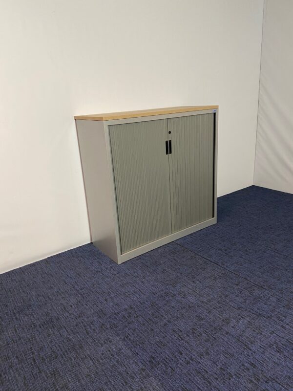 Roldeurkast Voortman, aluminium/grijs, nieuw topblad in kleur naar keuze, H 118 x B 120 x D 47 cm.