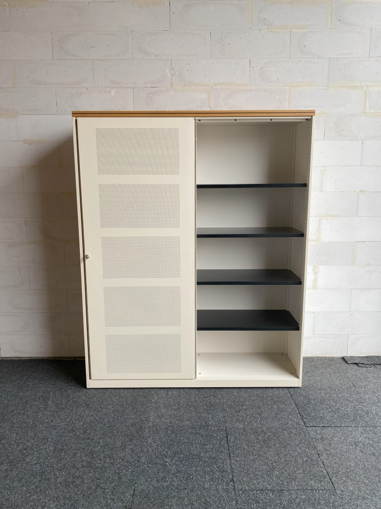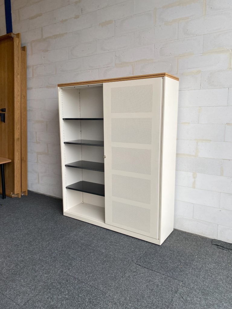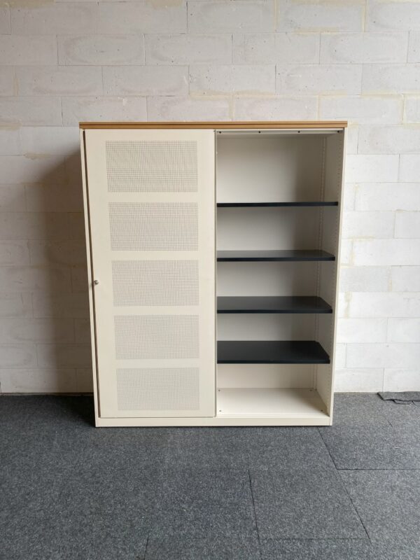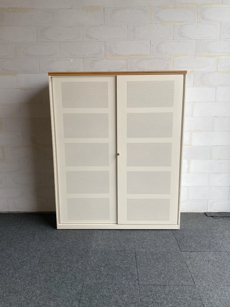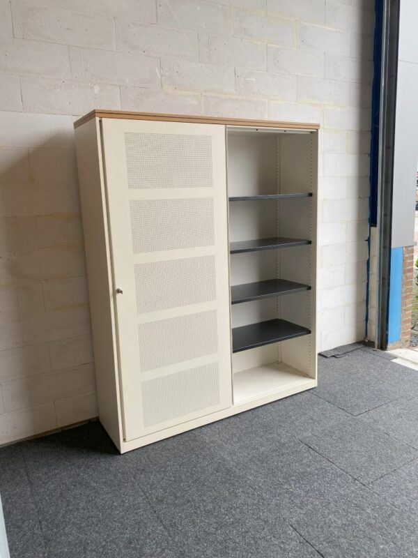 Schuifdeurkast Ahrend (akoestisch), gebroken wit, bamboe topblad, H 200 x B 160 x D 45 cm.