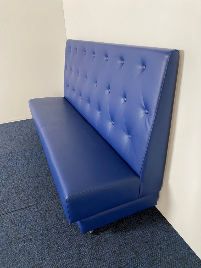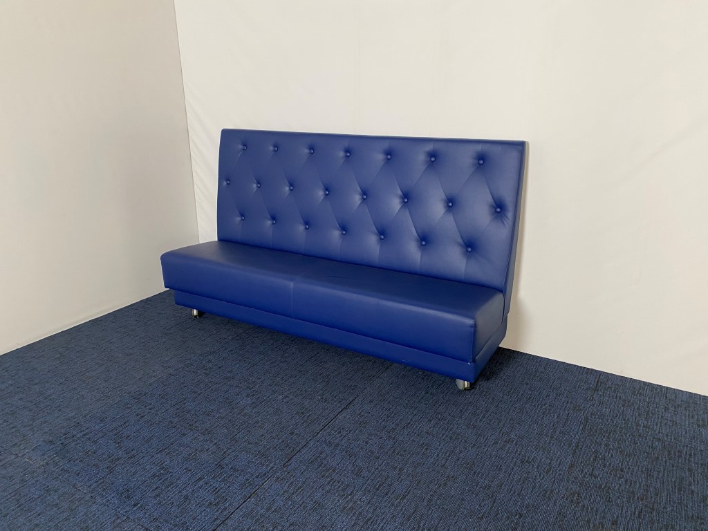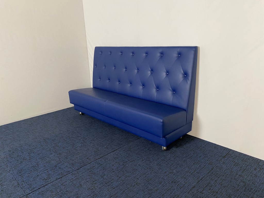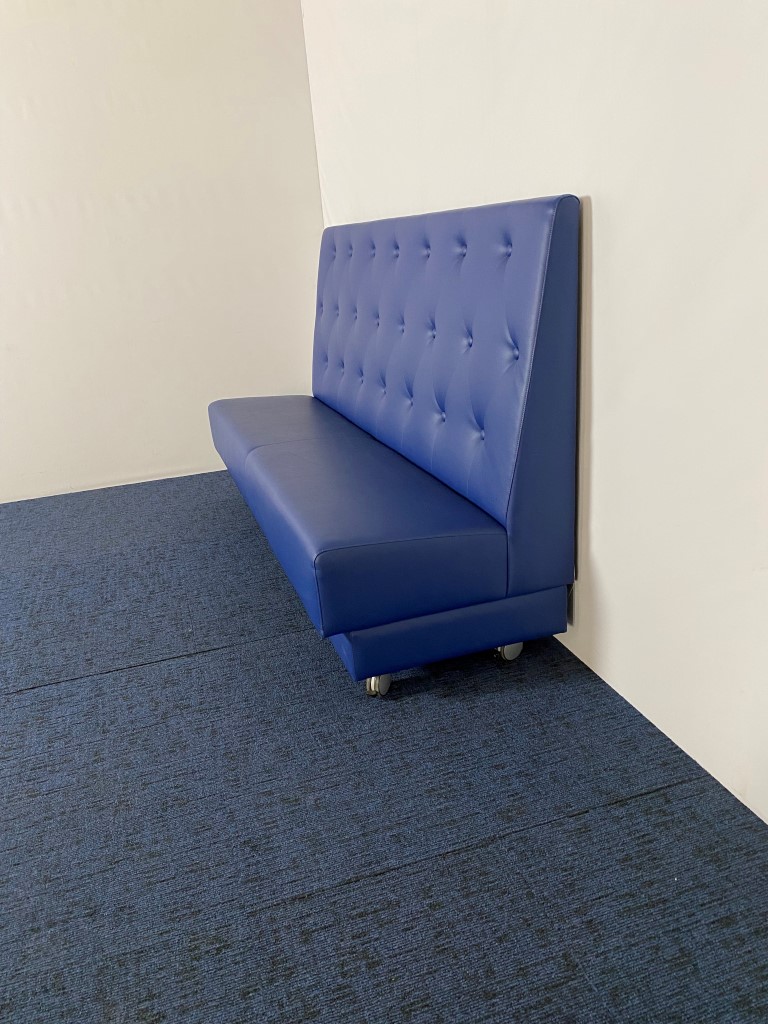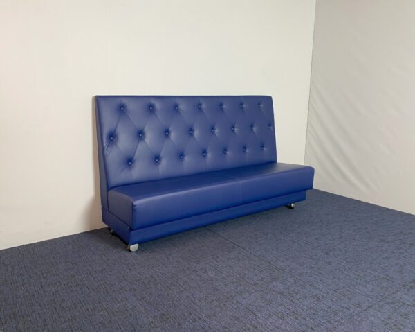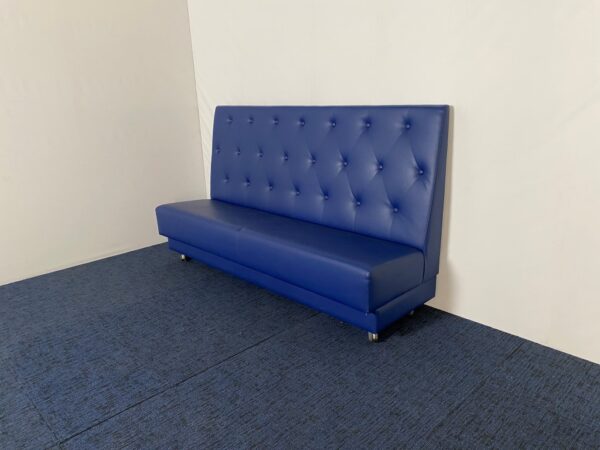 Treinbank (verrijdbaar), blauw leder, H 120 x B 205 cm.