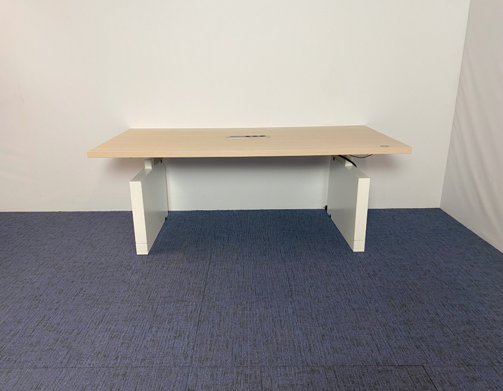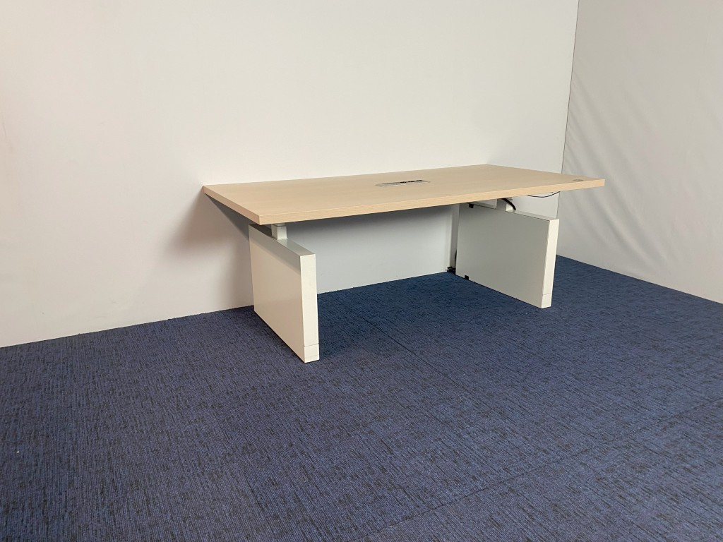 Vergadertafel zit/sta Voortman (elektrisch, incl. fliptop), licht eiken blad, wit onderstel, 200 x 100 cm.
