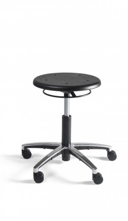 Werkkruk CS PU Aluminium, ronde PU zitting, aluminium gepolijst voetkruis