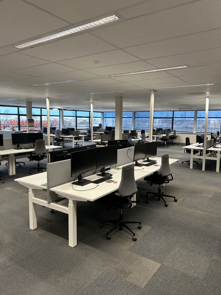 Voor Hitachi in Amsterdam hebben wij een compleet refurbished kantoor gerealiseerd. Het project omvatte ongeveer 150 duo zit/sta bureaus, voorzien van praktische akoestische scheidingswanden voor optimale privacy en werkcomfort. De werkplekken zijn gecombineerd met ergonomische Axia BMA Pro bureaustoelen.