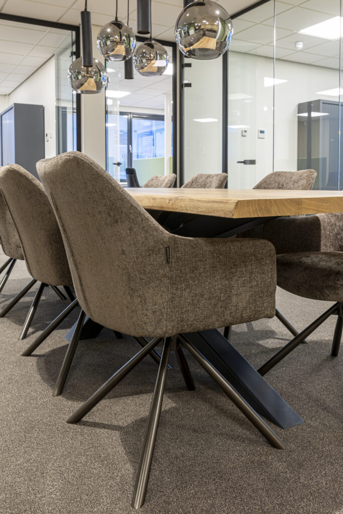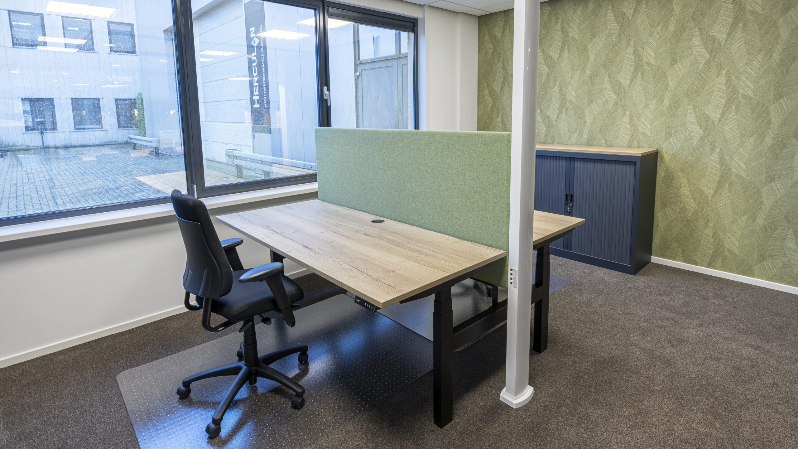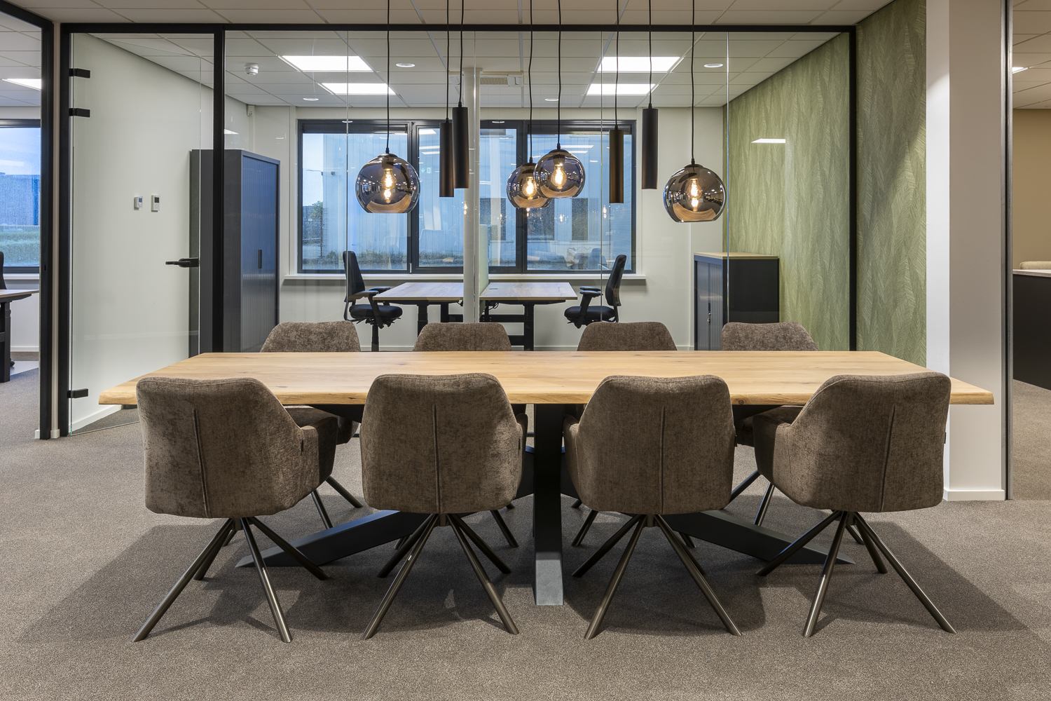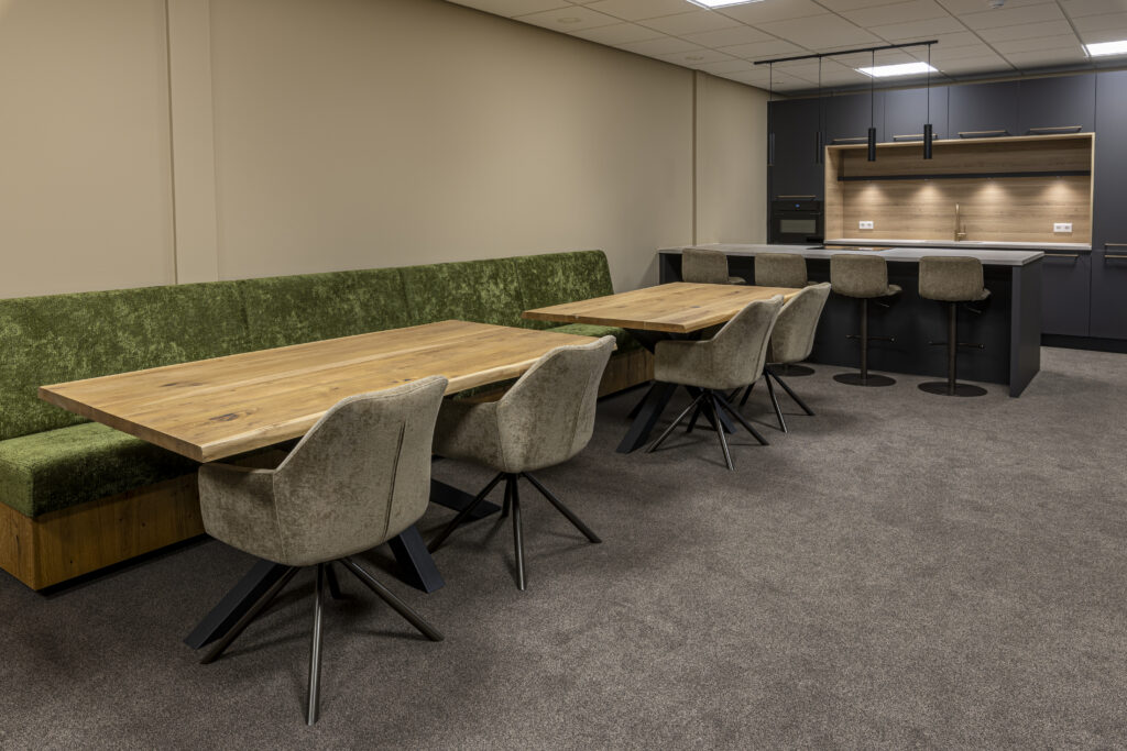 De werkplekken zijn uitgerust met bench zit/sta bureaus, aangevuld met akoestische wanden die zorgen voor rust en optimale concentratie. Daarnaast hebben we stijlvolle vergadertafels geplaatst en de ruimte ingericht met praktische kasten en comfortabel kantinemeubilair.